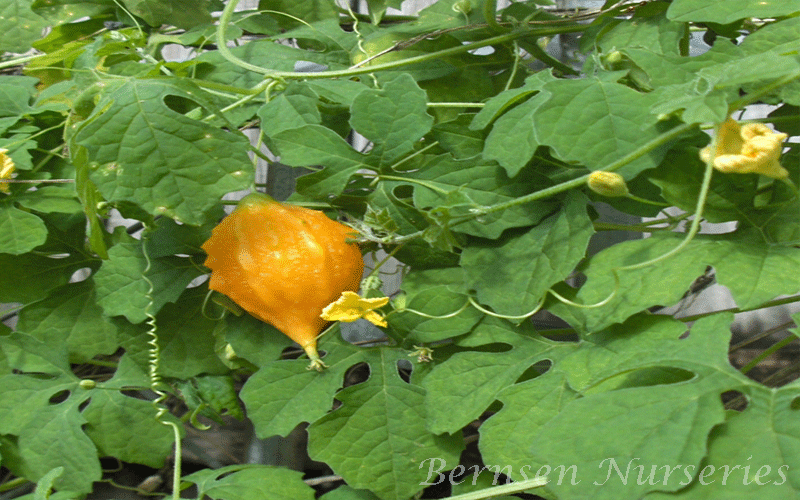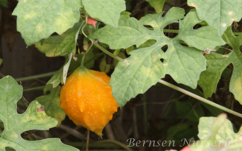 The plant: As most cucurbits, the plant is an annual running vine. The leaves are alternate and deeply notched into five to seven lobes. The lobes of the blades are rounded to pointed and usually have teeth on the margins. The flowers are yellow and occur singly on stalks bearing a modified leaf near the middle. The fruit of the balsam apple is about 3 inches long, egg shaped, pointed, bumpy, ribbed and golden yellow to bright orange when ripe.