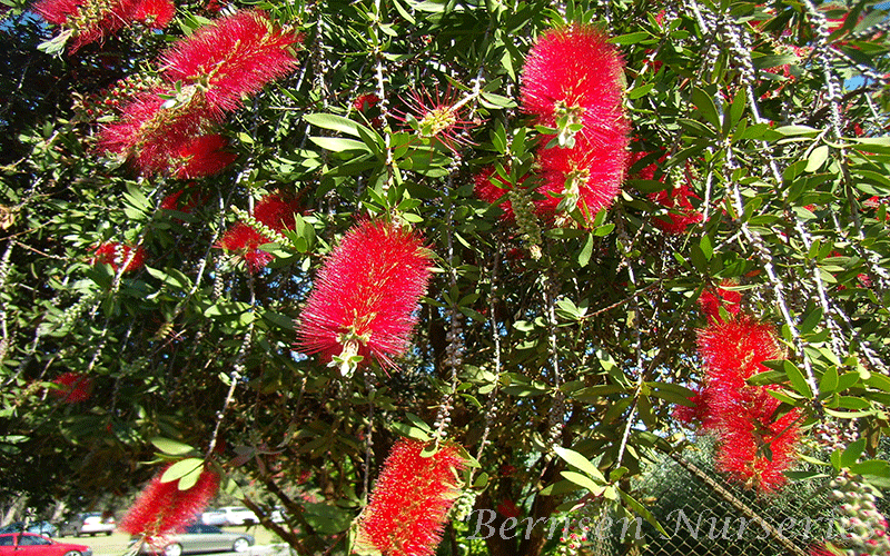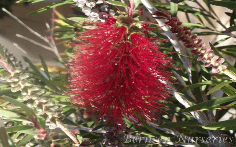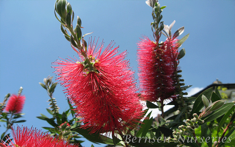 A great landscape accent plant, this bottlebrush tree is perfect for the corner of the house or near the entry though not too near, honeybees love the red flowers.