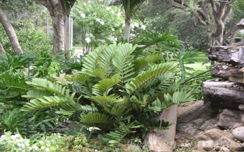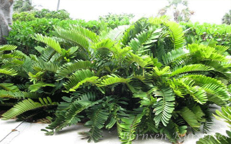It does have pinnate leaves like a palm tree, but they are rounded and it has a thick tuberous stem. The evergreen leaflets grow in opposing pairs of up to 12 per stem. It is a low growing plant that may spread 3 to 4 feet and an underground trunk. The trunk stores moisture in times of drought, which makes Zamia ideal for xeriscape gardens. Cardboard palm care requires enough moisture to keep the trunk fat and healthy. Never let it dry to the point that the trunk and stem are wrinkled or dry.
