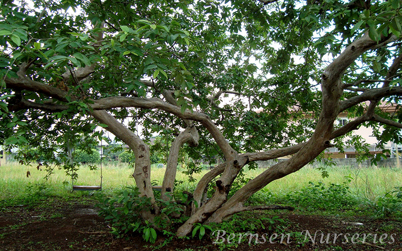The guava fruit grows on a small tree with a wide, short canopy and a sturdy single to multi-stemmed trunk. The guava tree is an interesting plant with mottled greenish bark and long 3- to 7-inch serrated leaves.